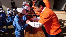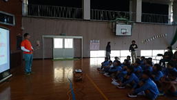 まず【火育】の部では、体育館でスライドを使いながらクイズを出題するなど、児童の皆さんに関心を持ってもらえるよう工夫をしながら、「火について」、「火と人の関係」、「人と火の歴史」、「LPガス」について学んでもらいました。 座学終了後は、体育館の外に移動して、まずマッチ擦りに挑戦してもらいました。まだ4年生なのでほとんど児童の皆さんが「マッチ擦りの経験がない」と答えていましたが、実際にマッチを擦ってみるとみんな上手にマッチ擦りができていました。 次にかまど体験、組立て式かまどを用いて地元唐川地区で獲れた新米とミネラルウォーターでご飯を炊く体験学習を行いました。