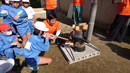 スタッフからかまどや羽釜などについて説明があった後、実際にかまどを使った炊飯に取りかかりました。代表の児童が薪にマッチの火を投げ入れ、かまどの火力を上げる際には、何人かの児童に火吹き竹で空気を送る作業に挑戦してもらいました。かまどのご飯を炊いている間、児童の皆さんには古代の火おこし体験(紐キリ式火おこし)に挑戦してもらいました。