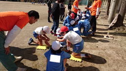 その後、児童の皆さんには6つの班に分かれてもらい、同級生とペアを組んで火おこしに挑戦してもらいました。なかなか火種ができない児童も多く、「腕が痛い」「疲れた」と感想を漏らしながらも、やっとの思いで赤く燃える火種ができると、「火が付いた」と歓声を挙げていました。