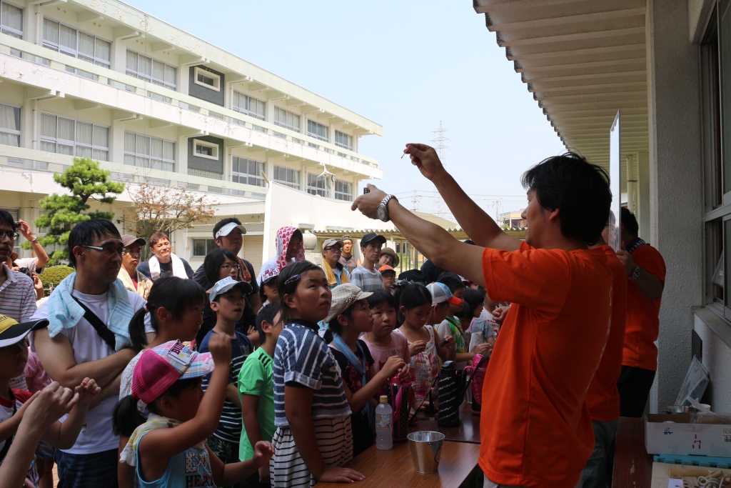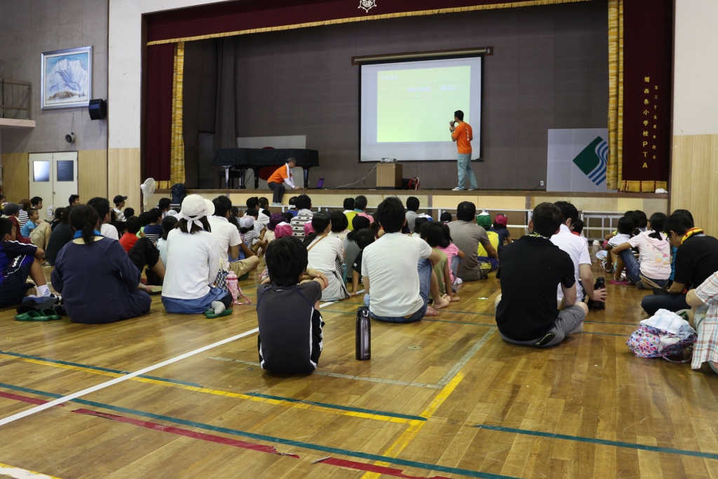 去る8月1日(土)、西条市神拝の西条市西条小学校において火育出張教室を開催いたしました。今回の出張教室は、PTA主催の夏休みイベント「学校の怪談」の中での開催となっており、西条支部などの協力のもと、1年生から6年生までの参加者78名とその保護者72名の合計150名を対象に実施されました。