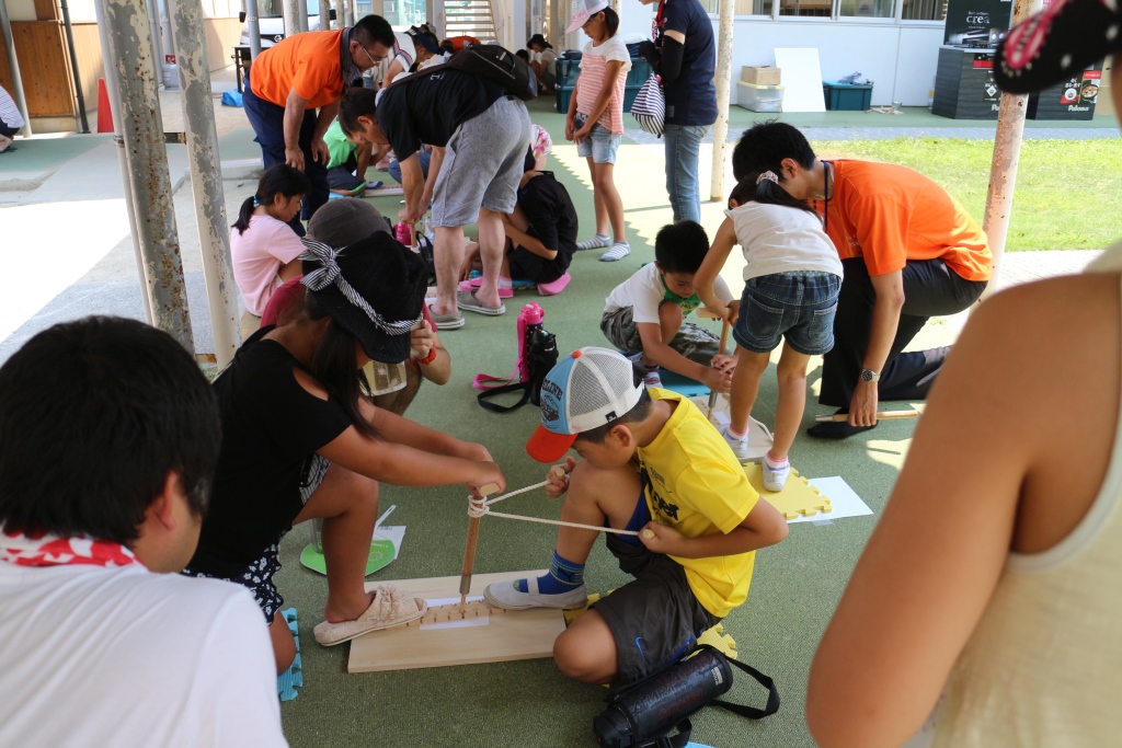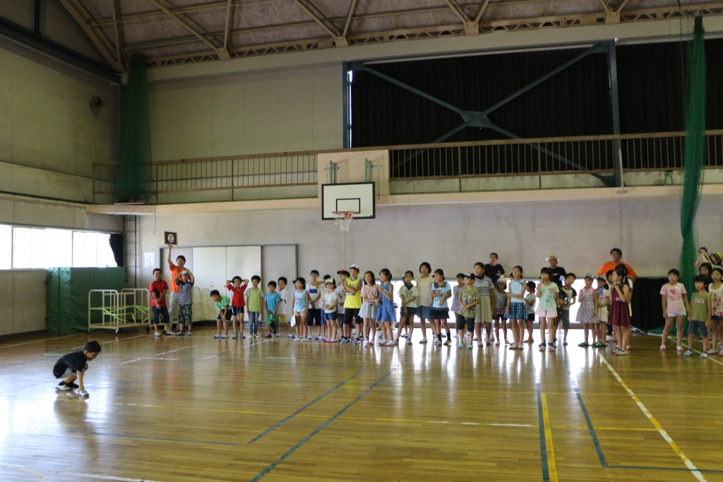 まず、体育館へ移動し、座学・クイズから出張教室がスタートしました。児童の皆さんに「火って何だろう?」、「火と人類の関係について」、「LPガスについて」といった内容について、スクリーンにスライドを投影して学んでもらいました。 途中、クイズ5問が出題されると、それぞれが正解だと思う番号を持ったスタッフのところへ走って分かれるゲーム形式でクイズに挑戦し、楽しみながら火に関する知識を習得してもらいました。 その後、中庭に移動して体験学習が始まる前に、潟pロマより最新のSiセンサーコンロの機能などについて説明があった後、マッチ擦りに挑戦してもらいました。 お祭りで提灯になじみが深いためかマッチ擦りをしたことのある児童が多くいました。低学年の児童にはおっかなびっくりで挑戦している子供もいましたが、参加者の皆さんには正しいマッチの擦り方を学んでもらうことができました。 マッチ擦りに挑戦した後は、渡り廊下へ移動して、古代の火おこし(紐きり式)に挑戦。まずは青年部会委員が火おこしのお手本を見せて、火種で麻綿に発火させるデモンストレーションを行いました。その後、15のグループに分かれて古代の火おこしに挑戦してもらいました。猛暑の中、保護者などにヒキリ棒を押さえてもらい、必死にヒキ紐を引っ張って火をおこそうとするので、みんな汗だくになりましたが、古代の火おこしがいかに大変だったかをよく分かってもらうことができました。